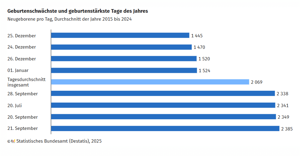 Betrachtet man alle Tage der vergangenen zehn Jahre einzeln, so war der 25. Dezember 2024 mit 1 230 Neugeborenen der geburtenschwächste und der 16. September 2016 der geburtenstärkste Tag (2 746).