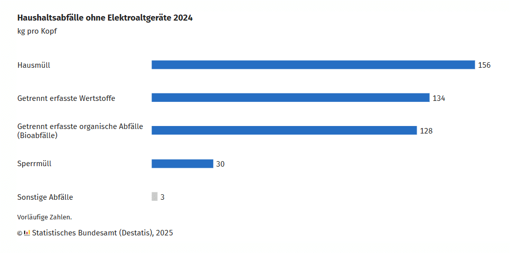 Das Aufkommen pro Kopf ist in 2024 ebenfalls in nahezu allen Haushaltsabfallarten gestiegen. Das Pro-Kopf-Aufkommen an Haus- und Sperrmüll wuchs gegenüber dem Vorjahr um 4 Kilogramm auf 187 Kilogramm. Bei den Bioabfällen war das Aufkommen im Jahr 2024 mit 128 Kilogramm pro Kopf um 7 Kilogramm höher als 2023. Die pro Kopf getrennt eingesammelte Menge an Wertstoffen blieb dagegen mit rund 134 Kilogramm unverändert gegenüber dem Vorjahr. (Quelle: Destatis)