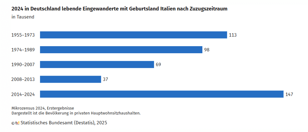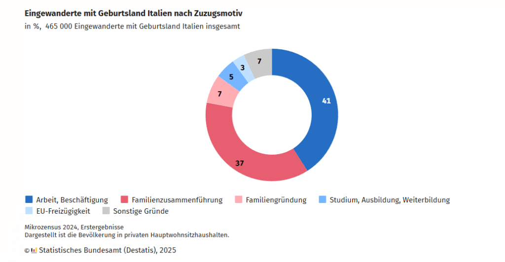 Die in Italien geborenen und nach Deutschland Eingewanderten lebten 2024 seit durchschnittlich 30,3 Jahren in Deutschland. Knapp ein Viertel (24 %, 113 000) von ihnen sind in der Zeit des Anwerbeabkommens von 1955 bis 1973 zugezogen, neben den ehemaligen Gastarbeitenden auch deren Familien. Knapp ein Drittel (32 %, 147 000) sind hingegen erst seit 2014 nach Deutschland eingewandert. Bei der Einreise waren die Menschen mit italienischer Einwanderungsgeschichte durchschnittlich 19,8 Jahre alt. 41 % (189 000) aller selbst Eingewanderten mit italienischen Wurzeln gaben an, hauptsächlich zum Zweck der Erwerbstätigkeit nach Deutschland gekommen zu sein und weitere 44 % (203 000) gaben familiäre Gründe als Hauptmotiv der Einwanderung an. Daneben nannten 5 % (22 000) Bildung als Hauptmotiv, 3 % (14 000) die EU-Freizügigkeit und 7 % (34 000) gaben sonstige Motive für ihre Zuwanderung an. Menschen mit italienischer Einwanderungsgeschichte stellten 2024 gemessen an allen Erwerbstätigen im Alter von 15 Jahren und älter einen Anteil von 0,9 %. Sie waren vor allem in der Gastronomie (3,6 %), der Speisezubereitung (2,4 %) sowie in Reinigungsberufen (2,1 %) und der Metallbearbeitung (2,1 %) überproportional vertreten.