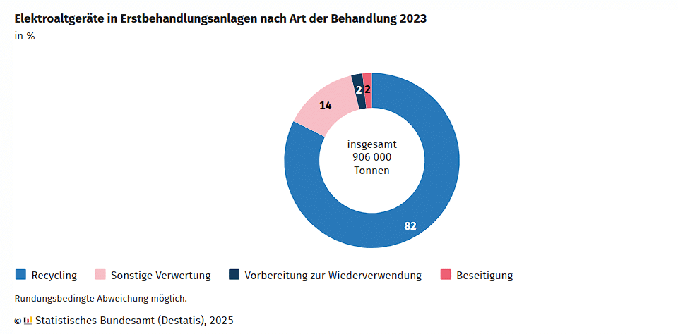 Die deutschen Erstbehandlungsanlagen haben im Jahr 2023 eine Recyclingmenge von 747.000 Tonnen Elektro- und Elektronikaltgeräten erreicht. Diese Menge entspricht einer Verwertungsquote von 82,4% der insgesamt 906.100 Tonnen angenommener Altgeräte, wie das Statistische Bundesamt (Destatis) anlässlich des Internationalen Tags des Elektroschrotts am 14. Oktober 2025 mitteilt.