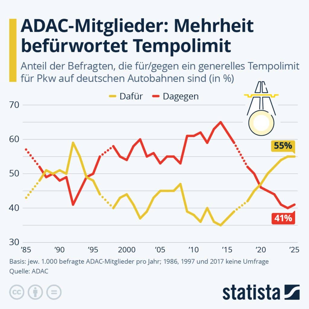 Der ADAC befragt seine Mitglieder jährlich dazu, ob sie ein generelles Tempolimit auf deutschen Autobahnen befürworten oder ablehnen. Von 1995 bis 2019 war die Mehrheit der Befragten gegen ein solches Tempolimit. Seit 2020 überwiegt dagegen der Anteil der Befürworter, wie die Statista-Grafik mit ADAC-Daten zeigt. Die Ergebnisse decken sich mit denen einer YouGov-Umfrage von 2024, derzufolge 57 Prozent der deutschen Wahlberechtigten ein Tempolimit von 130 km/h befürworten.