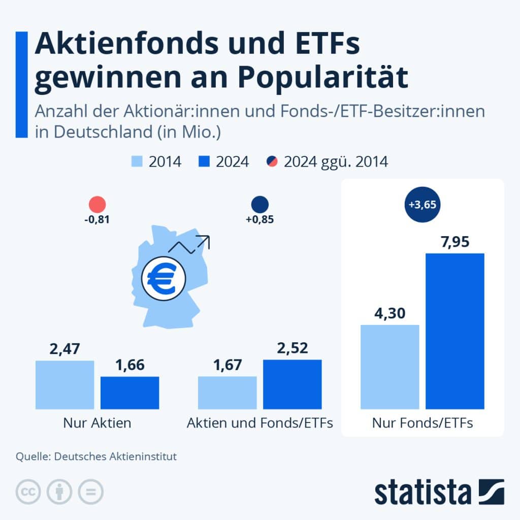 Die Zahl der Menschen in Deutschland, die Anteile an Aktienfonds oder Exchange Traded Funds (ETFs) besitzen, liegt 2024 bei rund acht Millionen. Gegenüber 2014 ist das ein Zuwachs von rund 3,7 Millionen und fast eine Verdoppelung, wie die Statista-Infografik auf Basis von Daten des Deutschen Aktieninstituts (DAI) zeigt. Reine Aktien-Investments sind im selben Zeitraum dagegen unbeliebter geworden. Die Verbreitung von gemischtes Anlage-Portfolio aus Aktien und Aktienfonds sowie ETFs hat ebenfalls zugenommen. Besonders weit verbreitet ist der Besitz von Wertpapieren übrigens in Südkorea, Indien und China. In Deutschland gilt ferner: Je höher das Einkommen, desto verbreiteter ist in Deutschland der Besitz von Aktien.