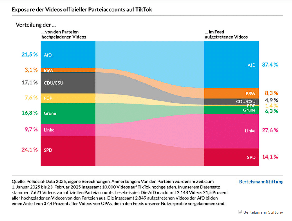 Im Bundestagswahlkampf 2025 wurden politische Videos mit Bezug zur AfD auch am schnellsten vorgeschlagen. Nach Erstellung eines Nutzerprofils auf TikTok wurden innerhalb von durchschnittlich elf bis zwölf Minuten Videos mit #afd angezeigt. Erst nach 70 Minuten folgte ein Video mit #spd. Anteilig wurden über alle Plattformen hinweg Videos mit #afd am häufigsten angezeigt (etwa 50 Prozent aller parteibezogenen Inhalte auf TikTok, X, Instagram und YouTube). (Quelle: Bertelsmann Stiftung)
