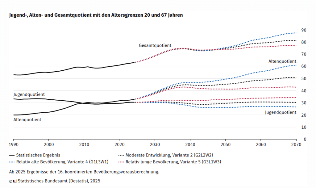 Im Jahr 2035 wird jede vierte Person in Deutschland 67 Jahre oder älter sein. Zu diesem Ergebnis kommen alle Varianten der 16. koordinierten Bevölkerungsvorausberechnung, die das Statistische Bundesamt (Destatis) am 11. Dezember 2025 bei einer Pressekonferenz in Berlin vorgestellt hat. Zum Vergleich: Im Jahr 2024 war nur jede fünfte Person im Rentenalter ab 67 Jahren. “Die Generation der Babyboomer befindet sich mitten im Übergang vom Erwerbsleben in den Ruhestand. Auf sie folgen deutlich kleinere Jahrgänge”, sagt Karsten Lummer, Leiter der Abteilung “Bevölkerung” im Statistischen Bundesamt. “Die Zahl der 67-Jährigen und Älteren wird in allen Berechnungsvarianten bis zum Jahr 2038 beständig steigen. Je nach Zunahme der Lebenserwartung werden dann 20,5 bis 21,3 Millionen Menschen im Rentenalter sein. Das sind 3,8 bis 4,5 Millionen mehr als heute”, erklärt Elke Loichinger, Leiterin des Referats “Demografische Analysen und Modellrechnungen, natürliche Bevölkerungsbewegungen”. Der Anteil der Personen ab 67 Jahren wird je nach Berechnungsvariante von 20 % im Jahr 2024 auf 25 % bis 27 % im Jahr 2038 zunehmen.