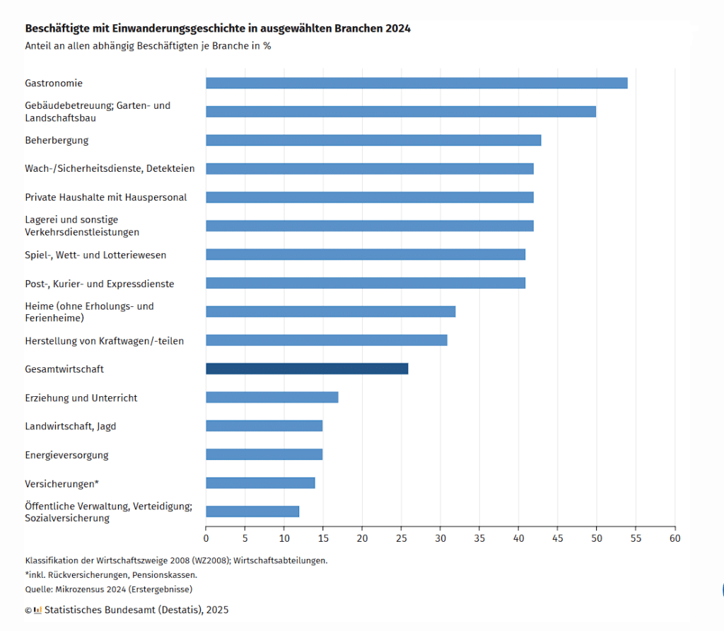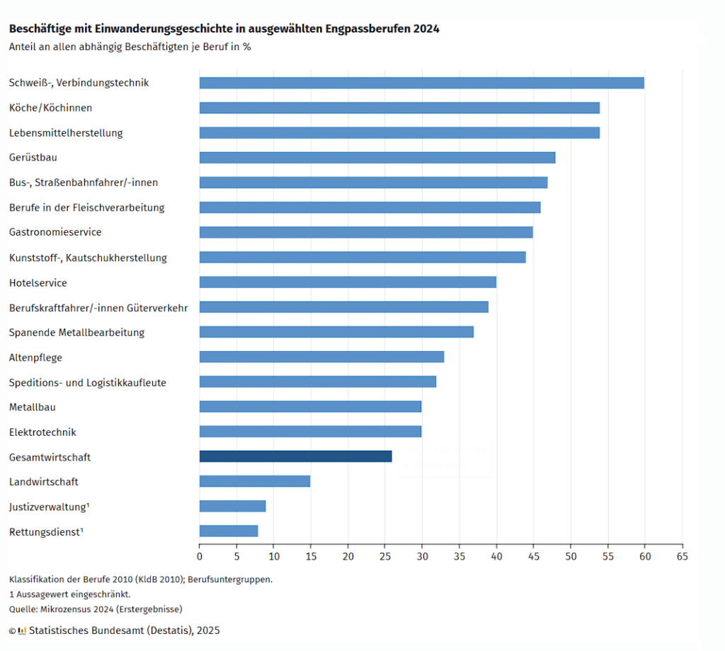 In zahlreichen Engpassberufen zeigt sich eine signifikant überproportionale Präsenz von Beschäftigten mit Einwanderungsgeschichte. Wie das Statistische Bundesamt (Destatis) mitteilt, wiesen im Jahr 2024 gesamtwirtschaftlich 26 % aller abhängig Beschäftigten eine Einwanderungsgeschichte auf – sie selbst oder beide Elternteile waren seit 1950 zugewandert. In kritischen Mangelberufen gemäß Engpassanalyse der Bundesagentur für Arbeit übertrifft dieser Wert jedoch deutlich den Durchschnitt.