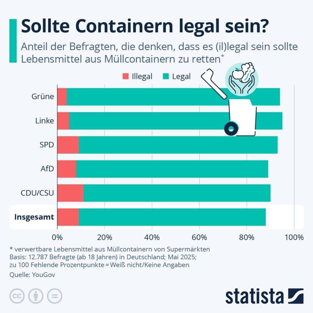Laut einer Online-Umfrage von YouGov sprechen sich 79 Prozent der Befragten dafür aus, dass Containern nicht strafbar sein sollte. Nur 9 Prozent halten es für illegal. Besonders deutlich ist die Zustimmung bei Anhänger:innen von Grünen und Linken (jeweils 90 Prozent), aber auch bei Wähler:innen von SPD (84 %) und AfD (81 %) ist die Mehrheit gegen eine Strafverfolgung. Selbst unter CDU/CSU-Wähler:innen liegt die Zustimmung bei 79 Prozent, bei der FDP bei 76 Prozent.