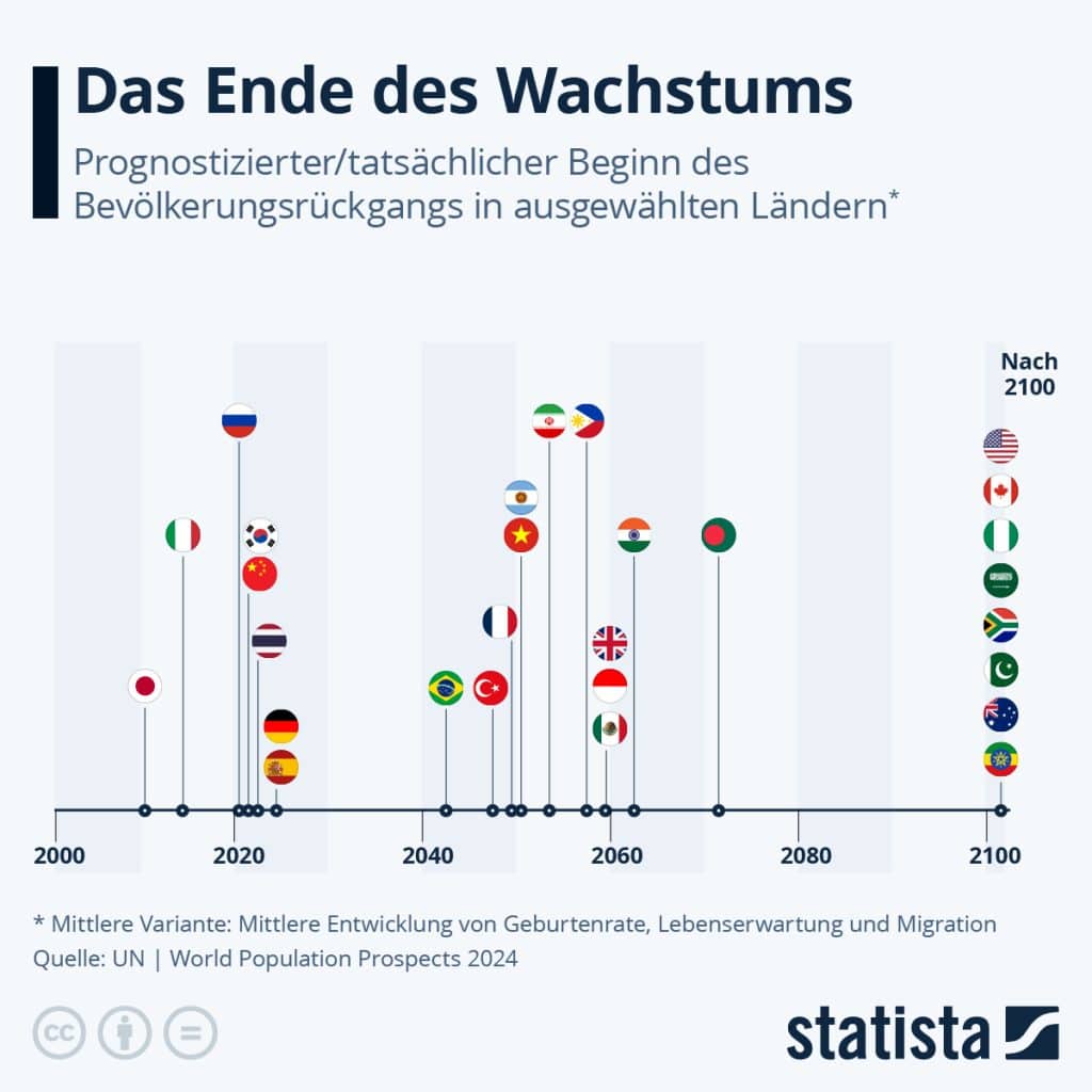 Laut der jüngsten Weltbevölkerungsprognosen der Vereinten Nationen werden viele Länder innerhalb dieses Jahrhunderts mit diesen Herausforderungen konfrontiert sein, sofern sie dies nicht bereits sind, darunter neben Deutschland und den oben genannten Ländern Japan und Italien auch China und Südkorea, für die 2021 der erste Bevölkerungsrückgang erwartet wurde. Die Bevölkerung Brasiliens wird voraussichtlich ab 2042 zurückgehen, die Frankreichs ab 2049 und sogar die riesige Bevölkerung Indiens wird voraussichtlich ab 2062 schrumpfen.