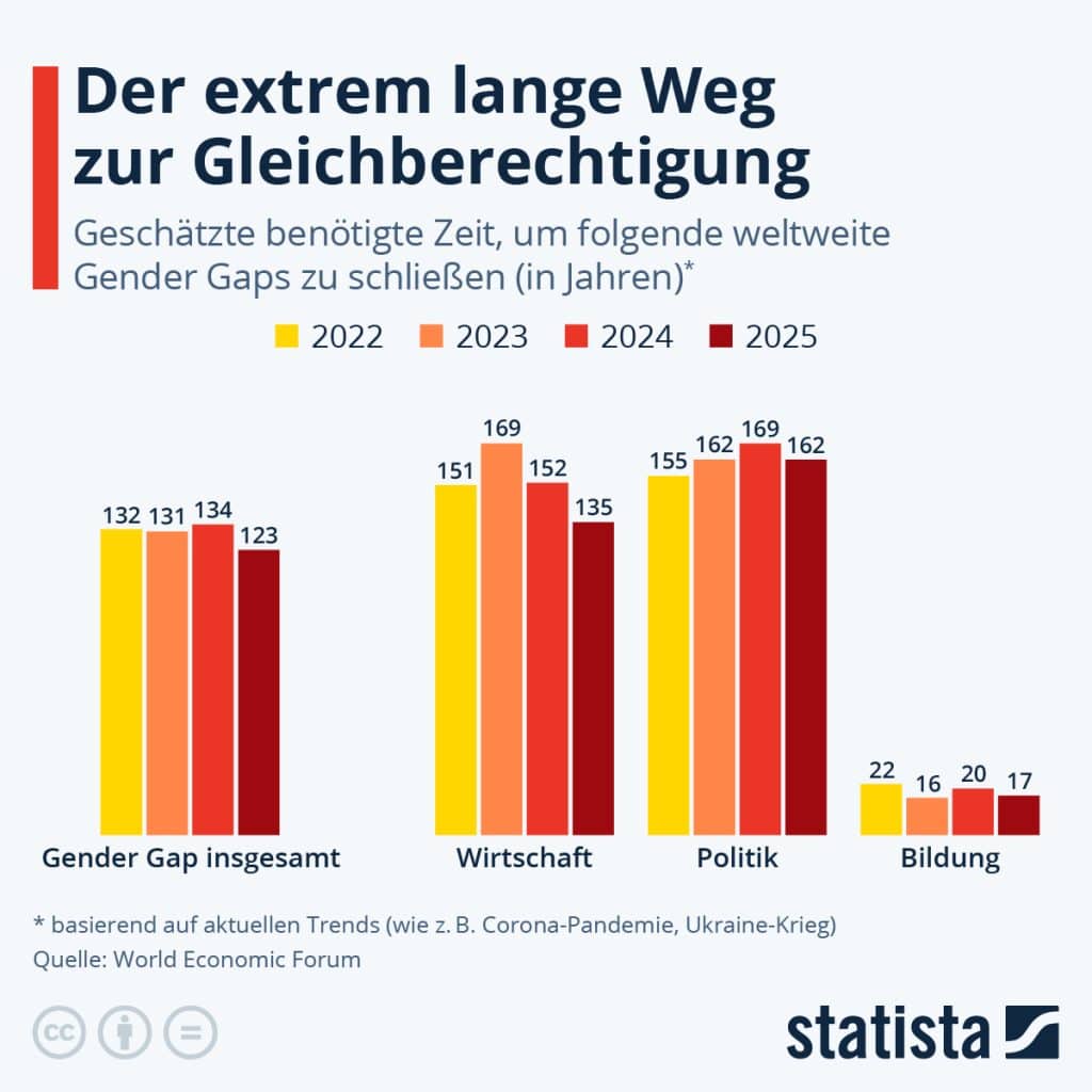 Der Gender Gap Report 2025 des World Economic Forums (WEF) zeigt, dass es aktuell noch 123 Jahre dauen wird, bis überall Geschlechtergerechtigkeit herrscht. Dabei war die Welt schonmal deutlich weiter: 2020 schätzten die Analyst:innen die Zeit bis zur vollständigen Gleichstellung von Frauen und Mädchen noch auf 100 Jahre. Für den Rückschritt wird unter anderem die Corona-Pandemie und die internationalen Krisen der letzten Jahre verantwortlich gemacht.