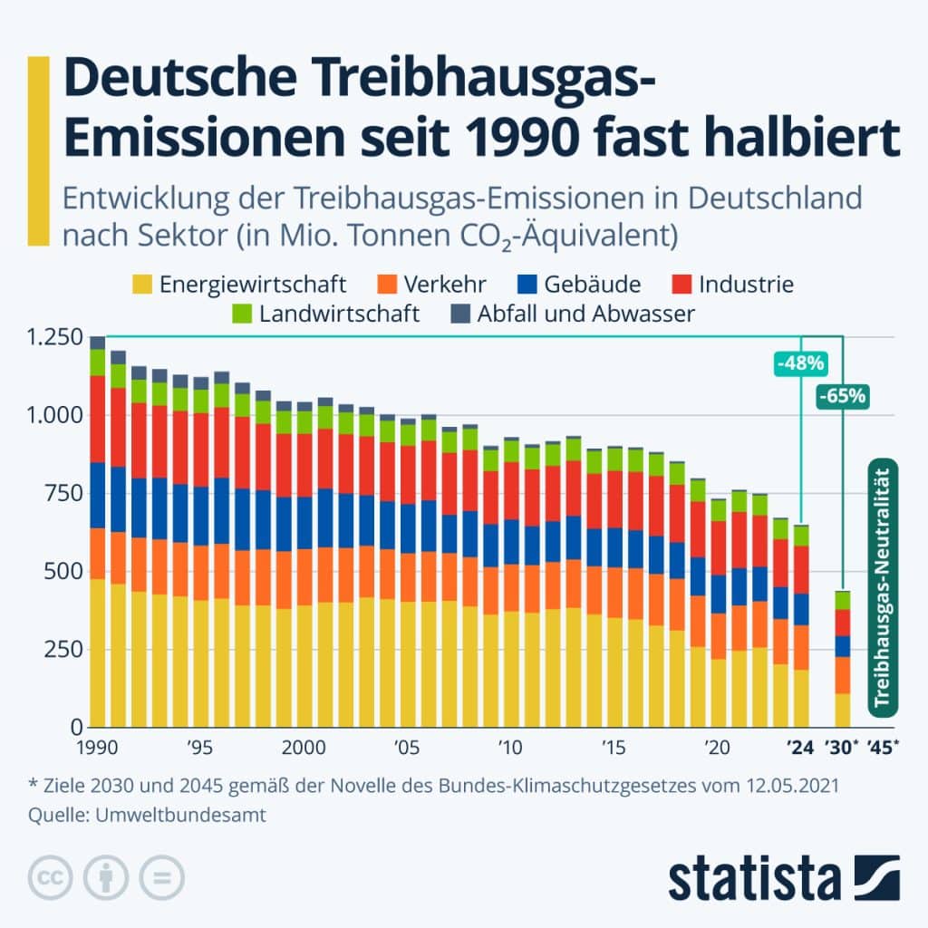 Der Ausstoß von Treibhausgasen geht in Deutschland seit Jahrzehnten zurück. Seit 1990 konnten die Emissionen von 1.252 Millionen Tonnen CO₂-Äquivalent im Jahr auf zuletzt 649 Millionen Tonnen reduziert werden – ein Rückgang von 48 Prozent. Bis 2030 sollen laut Klimaschutzgesetz eine Reduktion um 65 Prozent erfolgen. Dieses Ziel ist noch erreichbar, würde nach den jüngsten Projektionen jedoch knapp verfehlt werden. Bis zum Jahr 2045 will Deutschland vollständige Treibhausgas-Neutralität (Net Zero) erreichen, was nach aktuellem Stand deutlich schwerer zu realisieren sein wird.