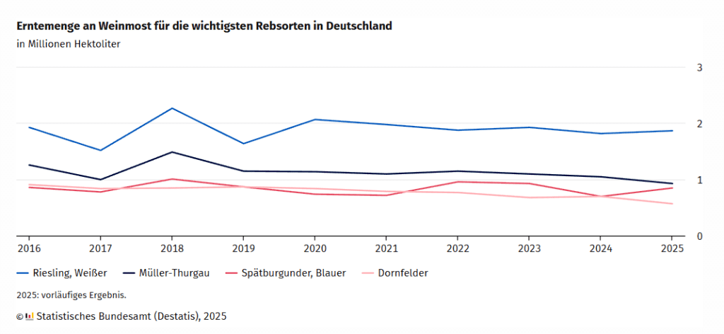 Nach der enttäuschenden Mosternte des Vorjahres zeigt sich für den deutschen Weinbau 2025 eine spürbare Erholung. Die aktuelle Schätzung des Statistischen Bundesamtes (Destatis) prognostiziert eine Erntemenge von 8,2 Millionen Hektolitern Weinmost. Dies bedeutet eine Steigerung von 5 % gegenüber dem schwachen Vorjahresergebnis von 7,8 Millionen Hektolitern.