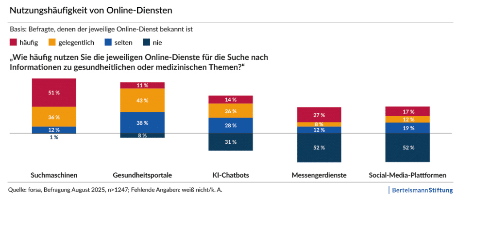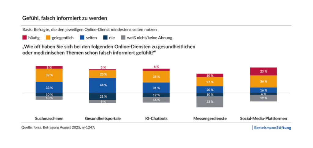 Zugleich jedoch zweifeln viele Menschen daran, dass digitale Angebote bei der Beantwortung von gesundheitlichen und medizinischen Fragen vertrauenswürdig genug sind. So geben 59 Prozent der Befragten an, dass sie sich bei der Suche nach gesundheitsbezogenen Inhalten auf Social-Media-Plattformen häufig oder gelegentlich falsch informiert gefühlt haben. Bei denjenigen, die Suchmaschinen dafür benutzen, sind es 47 Prozent, bei KI-Chatbots 41 Prozent. Hingegen fühlten sich nur 26 Prozent derjenigen, die bei Gesundheitsportalen nach Informationen gesucht haben, häufig oder gelegentlich falsch informiert.