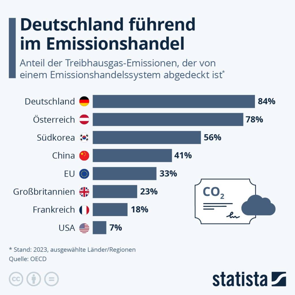 Wenn es um die Vermeidung von CO₂- und anderen Treibhausgasemissionen geht, setzt Deutschland voll auf den Emissionshandel. Laut einer aktuellen Studie der OECD ist Deutschland weltweit führend im Handel mit Emissionszertifikaten. Demnach waren in Deutschland 2023 84 Prozent aller Treibhausgas-Emissionen durch ein Emissionshandelssystem bepreist – keines der 79 untersuchten Länder erreichte einen höheren Wert.