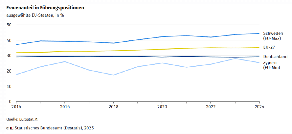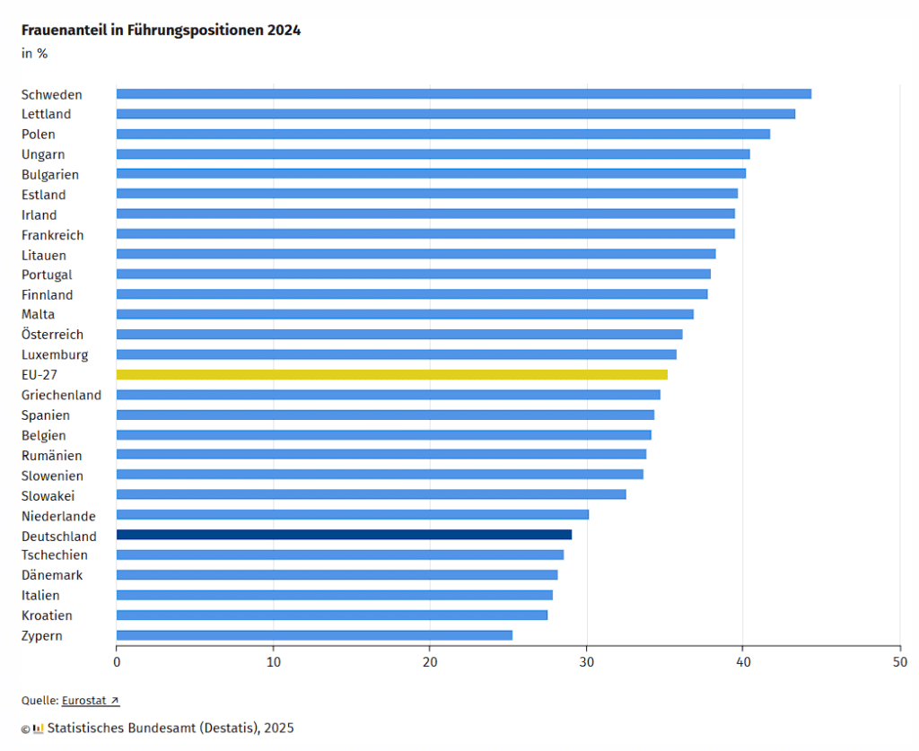 Frauen sind in den deutschen Führungsetagen weiterhin deutlich unterrepräsentiert: Während im Jahr 2024 rund 1,32 Millionen Männer in Deutschland eine Führungsposition hatten, waren es nur 540 000 Frauen. Wie das Statistische Bundesamt (Destatis) mitteilt, waren damit lediglich 29,1 % der Führungspositionen von Frauen besetzt. Dieser Wert lag deutlich unter dem Durchschnitt der Europäischen Union (EU) von 35,2 %. Den Spitzenplatz im EU-Vergleich belegte wie bereits im Vorjahr Schweden mit einem Frauenanteil von 44,4 %. Relativ hohe Quoten verzeichneten laut EU-Statistikbehörde Eurostat auch Lettland (43,4 %) und Polen (41,8 %). Das Schlusslicht bildete Zypern, wo nur 25,3 % der Führungskräfte weiblich waren.