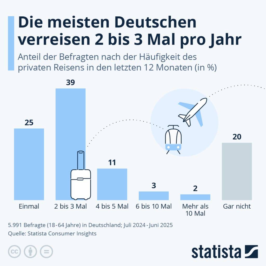Zwei bis drei Urlaube genießen die Deutschen mehrheitlich pro Jahr. Ein Fünftel ist dagegen in den letzten 12 Monaten gar nicht privat verreist, ein Fünftel einmal. Vier oder mehr Urlaube sind dagegen die Ausnahme. Das hat eine Befragung der Statista Consumer Insights ergeben. Durchgeführt wurde die Umfrage zwischen Juli 2024 und Juni 2025 – in einem Zeitraum also, in dem der Tourismus in Deutschland bei den Umsätzen bereits wieder auf Vor-Pandemie-Niveau liegt.