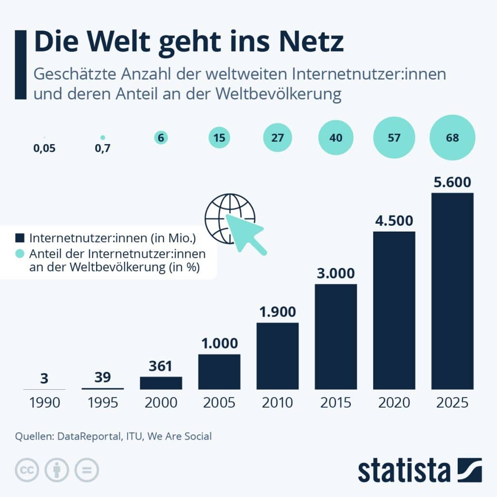 Die Anzahl der Surfer:innen ist seit Erfindung dieser bahnbrechenden Technologie rasant angestiegen; während im Jahr 1990 schätzungsweise drei Millionen Menschen zum für heutige Verhältnisse noch rudimentären Internet hatten, waren es zehn Jahre später bereits mehr als 360 Millionen. Einen besonderen Zuwachsschub bekam das Internet in den 2000er Jahren durch verbesserte Zugangstechnologien wie etwa DSL aber auch mobile Optionen.