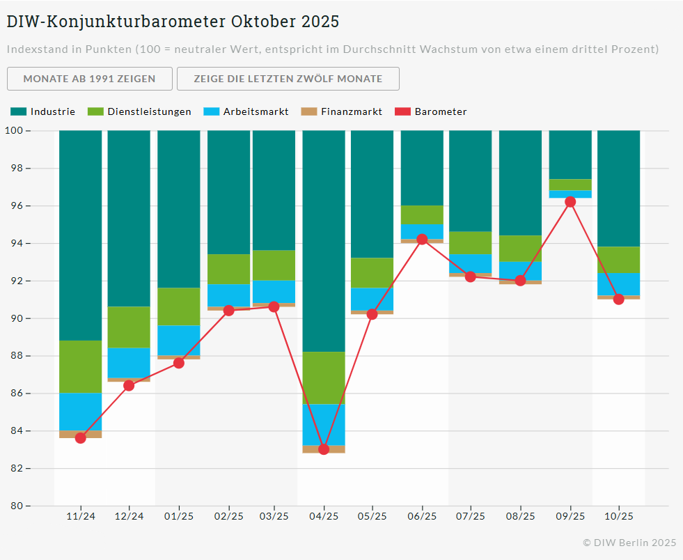 Das Konjunkturbarometer des Deutschen Instituts für Wirtschaftsforschung (DIW Berlin) sackte im Oktober merklich ab. Nachdem der Barometerwert im September noch einen Jahreshöchstwert von gut 96 Punkten erreichte, entfernt er sich mit nun 91,1 Punkten wieder deutlich von der neutralen 100-Punkte-Marke, die ein durchschnittliches Wachstum der deutschen Wirtschaft anzeigt. Weiterhin belasten zahlreiche Unsicherheiten: Die Exportindustrie schwächelt angesichts der feindseligen US-Handelspolitik, dem starken Wettbewerb mit China und der insgesamt hinkenden Weltwirtschaft. Außerdem sind viele Unternehmen wohl noch skeptisch, ob etwas aus dem von der Bundesregierung angekündigten „Herbst der Reformen“ wird. „Die beschlossenen finanzpolitischen Maßnahmen dürften zwar nach und nach Wirkung entfalten und die Binnenwirtschaft ankurbeln, aktuell ist davon allerdings noch wenig zu spüren“, sagt Geraldine Dany-Knedlik, Konjunkturchefin des DIW Berlin.