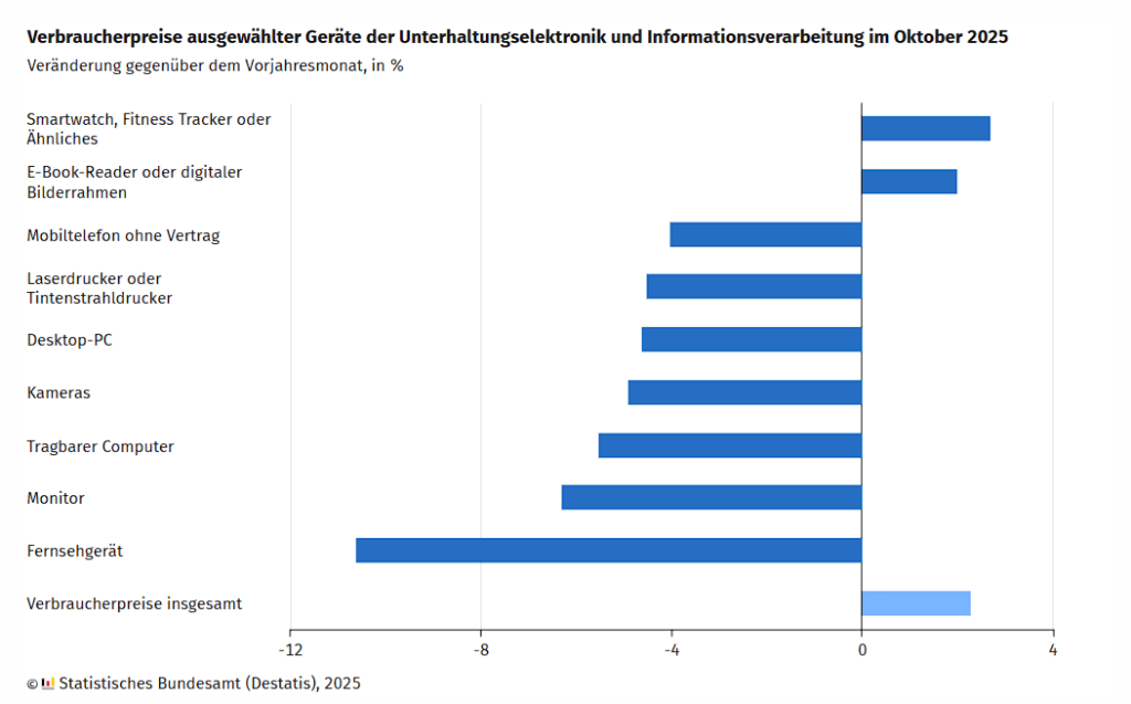 Preissteigerungen gab es dagegen bei E-Book-Readern oder digitalen Bilderrahmen (+2,0 %), auch Smartwatches, Fitnesstracker oder Ähnliches (+2,7 %) waren im Oktober 2025 teurer als ein Jahr zuvor.