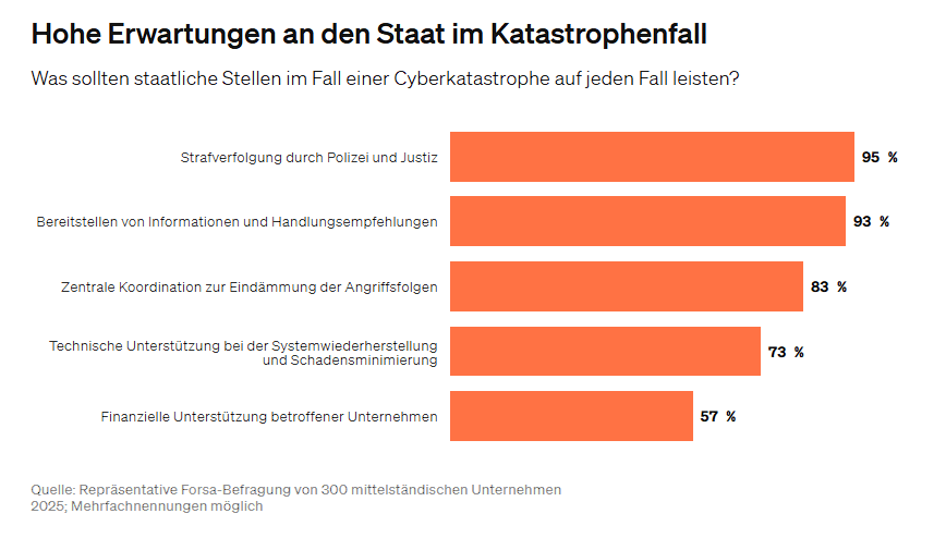 Trotzdem sind die Erwartungen an staatliche Stellen hoch: Über die Strafverfolgung und Aufklärung hinaus sehen 73 Prozent der Befragten es als Aufgabe des Staates, in einer Cyber-Katastrophe technische Hilfe zu leisten. 57 Prozent sehen den Staat sogar in der Pflicht, betroffenen Unternehmen finanziell zu helfen. „Die hohe Erwartungshaltung an den Staat steht in scharfem Kontrast zur mangelhaften Cybersicherheit vieler Unternehmen“, sagt Asmussen.