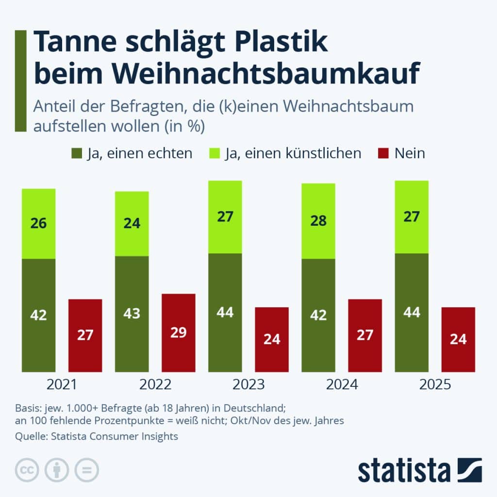 Demnach wollen sich 44 Prozent der Umfrageteilnehmer:innen 2025 einen echten Weihnachtsbaum zulegen. Das liegt in etwa auf Linie mit den Baumentscheidungen der letzten Jahre, wie der Blick auf die Statista-Grafik zeigt. Dagegen sind Plastikbäumen vergleichsweise unbeliebt, 27 Prozent wollen dieses Jahr eine künstliche Tanne aufstellen. Ein ähnliche großer Anteil der Befragten verzichtet ganz auf einen Baum. (Quelle: Statista/cw)