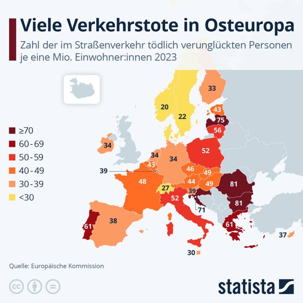 Die Zahl der Verkehrstoten variiert im Europavergleich deutlich. Das zeigt die Statista-Grafik auf Basis von Zahlen der Europäischen Kommission. Besonders hoch ist die Zahl der tödlich Verunglückten in Relation zur Einwohnerzahl in vielen Ländern Osteuropas. An der Spitze liegen Rumänien und Bulgarien mit jeweils 81 tödlich verunglückten Personen je eine Million Einwohner. Auf Platz drei folgt Lettland mit 75 Todesfällen, auf Rang vier liegt Kroatien mit 71 Toten. Auch in Griechenland (65 Tote) und Portugal (61 Tote) sterben verhältnismäßig viele Menschen im Straßenverkehr. Deutschland liegt mit 34 Toten im unteren Mittelfeld.