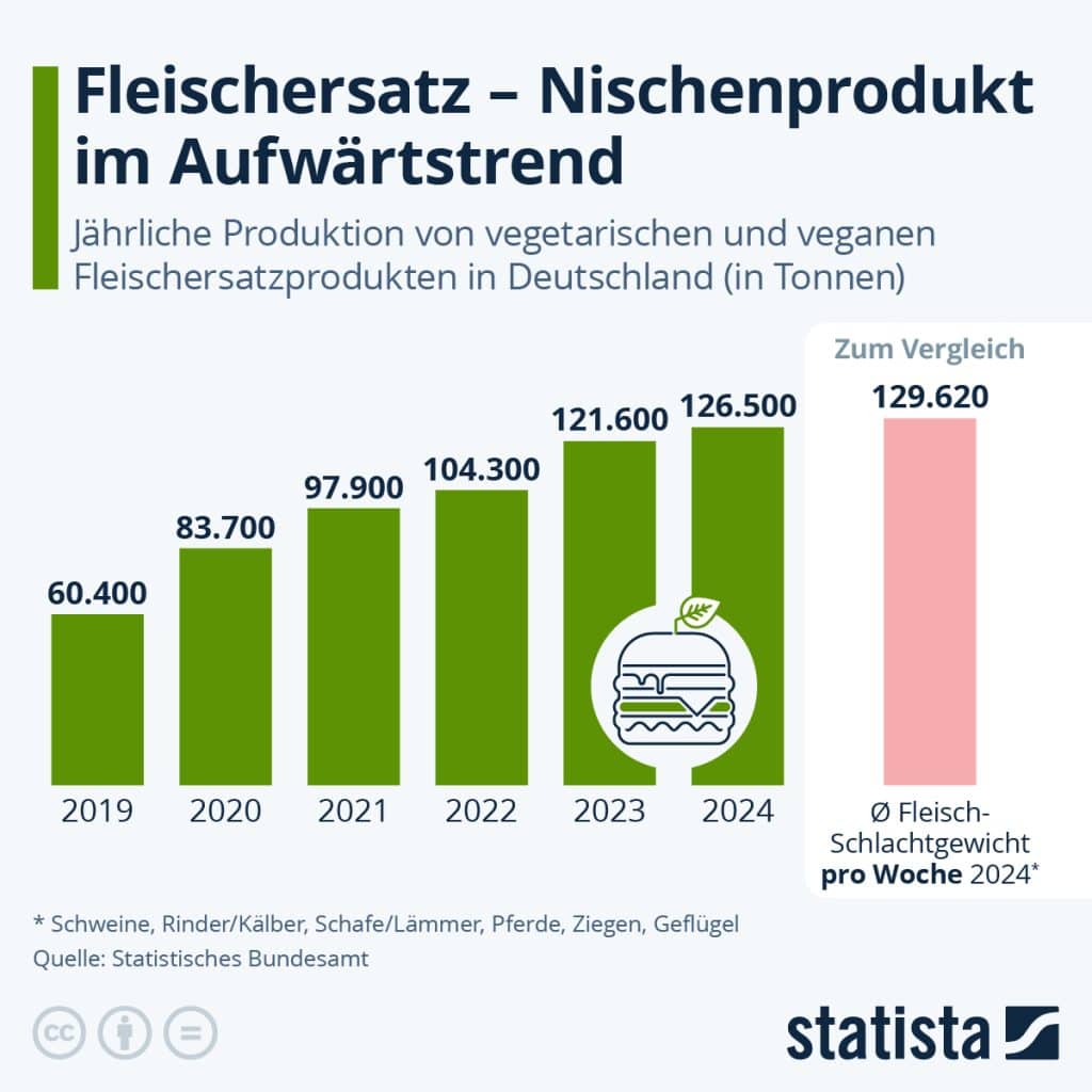 So wurden 2024 in Deutschland 126.500 Tonnen Fleischersatz hergestellt – Tendenz steigend, wenn auch zuletzt nur noch leicht (+4 Prozent). Allerdings wurden im selben Jahr pro Woche durchschnittlich Schweine, Rinder, Kälber, Schafe, Lämmer, Pferde, Ziegen und Geflügel mit einem Gesamtgewicht von fast 130.000 Tonnen geschlachtet – auf das Gesamtjahr gerechnet kommen 6,7 Millionen Tonnen zusammen. (Quelle: Statista/cw)