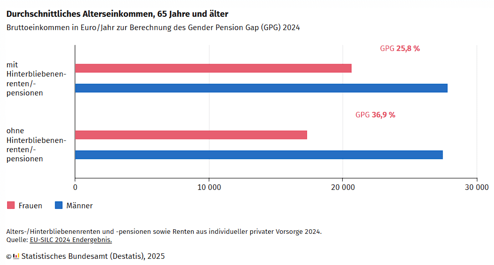Da Hinterbliebenenrenten und -pensionen von der Erwerbstätigkeit des Ehepartners beziehungsweise der Ehepartnerin abhängen, handelt es sich bei diesen Einkünften um sogenannte abgeleitete Ansprüche. Werden diese abgeleiteten Ansprüche auf Altersversorgung bei der Betrachtung ausgeklammert, ergibt sich ein noch höherer Gender Pension Gap von 36,9 %.