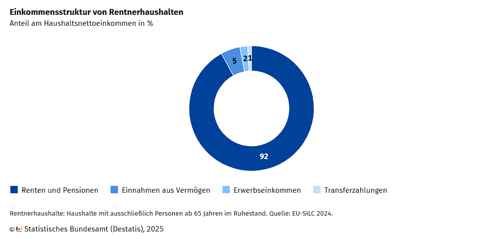 Rentnerhaushalte erhalten ihr Einkommen überwiegend aus Alterseinkünften, aber auch andere Quellen tragen dazu bei. Bei Haushalten, in denen ausschließlich Rentnerinnen und Rentner beziehungsweise Pensionärinnen und Pensionäre lebten, machten Renten und Pensionen durchschnittlich 92 % des Einkommens aus. 5 % des Einkommens stammte aus Einnahmen aus Vermögen, 2 % aus Erwerbstätigkeit, 1 % aus Transferzahlungen wie etwa Grundsicherung im Alter.