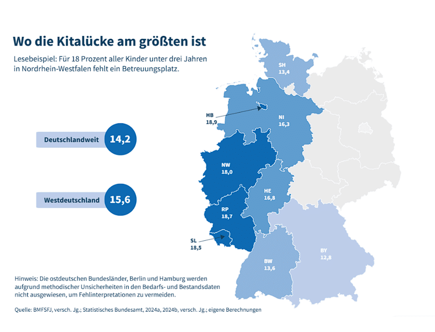 In Deutschland fehlen weiterhin Kitaplätze: 14,2 Prozent der unter Dreijährigen haben keinen Betreuungsplatz, wie eine neue Studie des Instituts der deutschen Wirtschaft (IW) zeigt. Besonders im Westen bleibt die Lage angespannt.