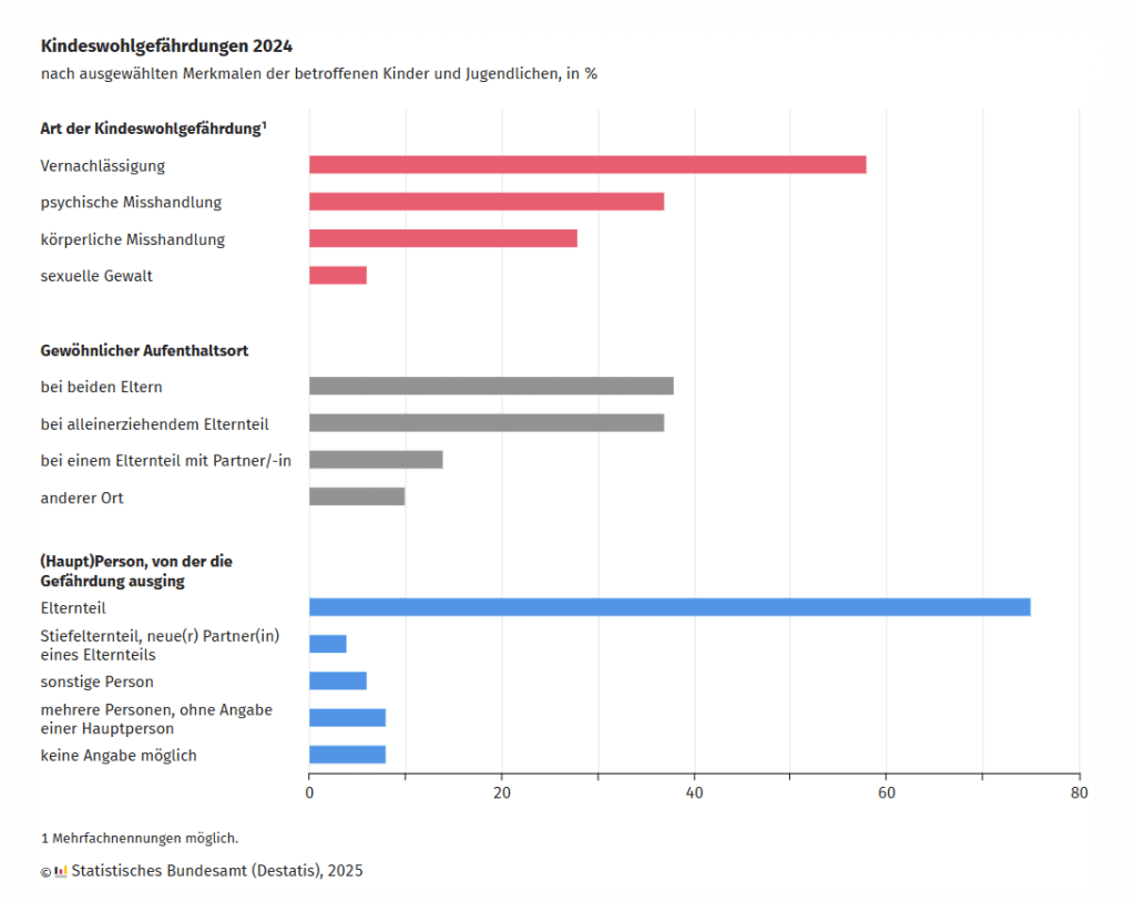 Dabei ging die Kindeswohlgefährdung in 75 % aller Fälle – ausschließlich oder hauptsächlich – von einem Elternteil aus. In weiteren 4 % war es ein Stiefelternteil, die neue Partnerin oder der neue Partner eines Elternteils und in 6 % eine sonstige Person, wie zum Beispiel eine Tante, der Pflegevater, ein Trainer beziehungsweise Trainerin oder ein Erzieher beziehungsweise Erzieherin. In 8 % der Fälle konnte zwar angegeben werden, dass die Gefährdung von mehreren Personen ausging, aber keine Hauptperson. Und in ebenfalls 8 % war gänzlich unbekannt oder unklar, von wem die Kindeswohlgefährdung ausging.