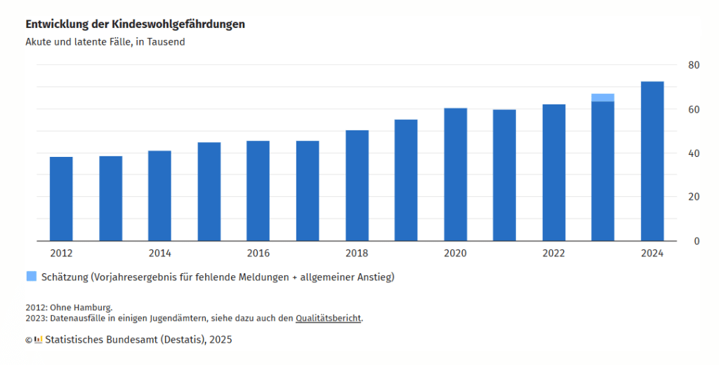 Die Zahl der Kindeswohlgefährdungen in Deutschland hat das dritte Mal in Folge einen neuen Höchststand erreicht: Im Jahr 2024 stellten die Jugendämter in Deutschland bei rund 72 800 Kindern oder Jugendlichen eine Kindeswohlgefährdung durch Vernachlässigung, psychische, körperliche oder sexuelle Gewalt fest. Wie das Statistische Bundesamt (Destatis) mitteilt, stieg die Zahl der Kindeswohlgefährdungen damit binnen fünf Jahren um fast ein Drittel (+31 %) oder 17 300 Fälle. Im Jahr 2019 – dem Jahr vor Ausbruch der Corona-Pandemie – hatte das Niveau noch bei rund 55 500 Kindeswohlgefährdungen gelegen.