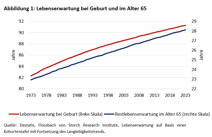 Von steigendem Wohlstand und medizinischem Fortschritt profitierten in der Vergangenheit alle Altersgruppen. Erreichten 1973 von 100.000 neugeborenen Menschen in Westdeutschland statistisch nur rund 77.000 das 65. Lebensjahr, waren es 2023 knapp 90.000. Heute erreicht mehr als jeder zweite Mensch im Alter von 65 Jahren auch das 85. Lebensjahr. Im Jahr 1973 war dies nur einem von vier Menschen vergönnt.