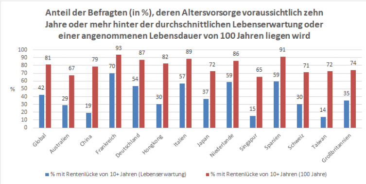 Ermittelt wurde die Zehnjahreslücke durch den Vergleich der Lebenserwartung im jeweiligen Land mit der Erwartung der Befragten, wie lange ihre Altersvorsorge reicht. Weltweit planen 42 % um mindestens zehn Jahre zu kurz; in Deutschland sind es sogar mehr als die Hälfte (54 %). Mit der weiter steigenden Lebenserwartung wächst diese Herausforderung. Bis 2050 werden weltweit voraussichtlich 3,67 Millionen Menschen das Alter von 100** Jahren erreichen. Betrachtet man eine potenzielle Lebensspanne von 100 Jahren, haben fast vier von fünf Menschen ab 50 Jahren (81 %) eine Lücke von mehr als einem Jahrzehnt – mit deutlichen Unterschieden je nach Land. In Deutschland steigt dieser Wert sogar auf fast neun von zehn (87 %), die nicht ausreichend vorbereitet sind.