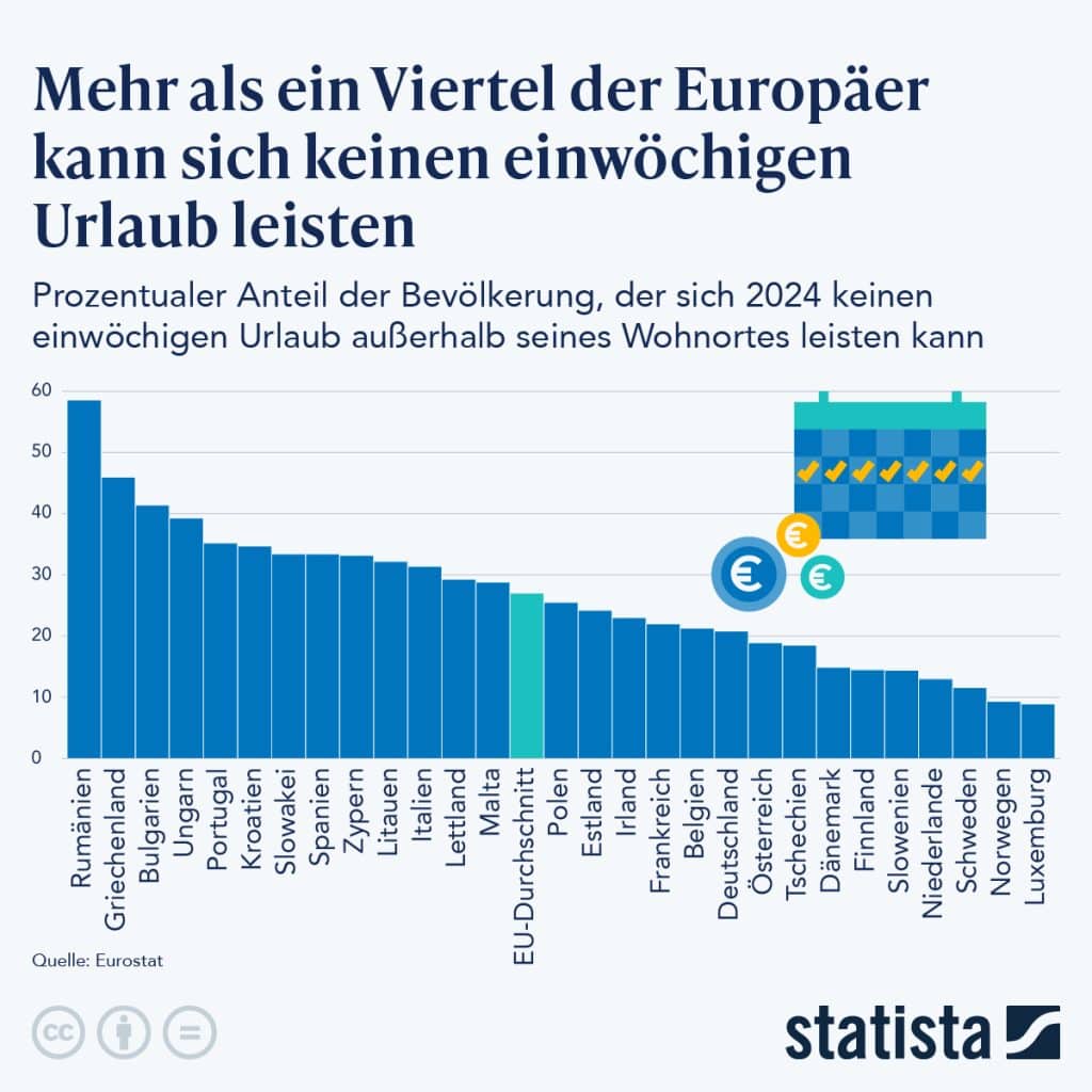 Im Durchschnitt konnten sich 27 % der Menschen ab 16 Jahren in der Europäischen Union im Jahr 2024 keinen einwöchigen Urlaub leisten.