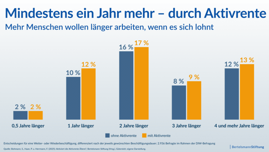 Die geplante Aktivrente hat das Potenzial, die Erwerbsbereitschaft von Rentner:innen in Deutschland zu steigern: Unter den derzeitigen steuerlichen Bedingungen für den Hinzuverdienst in der Rente sagen 52 Prozent der älteren Arbeitnehmer:innen, sie wollten nach Erreichen des Ruhestands nicht mehr weiterarbeiten. Gibt es dagegen, wie in der Aktivrente vorgesehen, die Möglichkeit, bis zu 2.000 Euro im Monat steuerfrei hinzuzuverdienen, verringert sich der Anteil derjenigen, die nicht mehr arbeiten möchten, um rund fünf Prozentpunkte. Fast alle der Befragten, die sich vorstellen können, weiterzuarbeiten, sagen zudem, sie seien bereit, ein Jahr oder mehr zu verlängern. Das ist das Ergebnis einer Untersuchung des Deutschen Instituts für Wirtschaftsforschung (DIW) im Auftrag unserer Stiftung. Befragt wurden 3.000 Personen im Alter von 60 bis 71 Jahren.