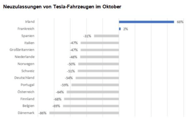In anderen europäischen Ländern entwickelten sich die Tesla-Neuzulassungen mehrheitlich ebenfalls sehr schwach. Nur in Frankreich und Irland wurden ein Wachstum registriert, in den übrigen westeuropäischen Ländern, für die bereits Zahlen vorliegen, gingen die Tesla-Neuzulassungen stark zurück – am stärksten in Dänemark und Schweden. Insgesamt schrumpften die Tesla-Neuzulassungen in diesen Märkten im Oktober um 50 Prozent.