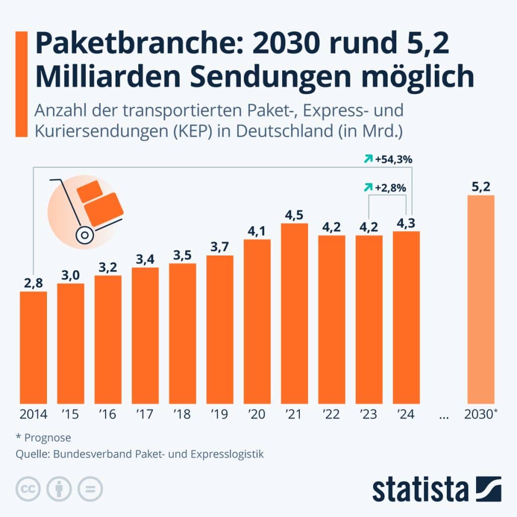 4,3 Milliarden Paket-, Express- und Kuriersendungen wurden laut Bundesverband Paket- und Expresslogistik (BPEX) 2024 hierzulande verschickt – das entspricht einer leichten Steigerung von 2,8 Prozent gegenüber dem Vorjahr. Wichtigster Treiber ist die positive Entwicklung im E-Commerce.