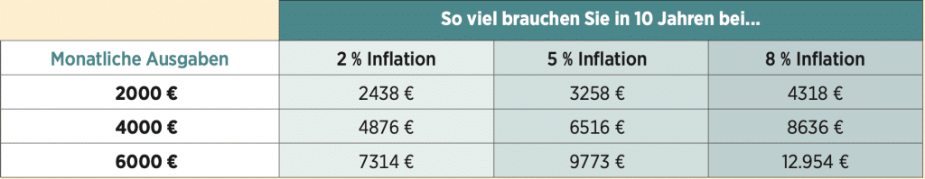 Beim Check des benötigten Kapitals fürs Alter muss immer die Inflation berücksichtigt werden. Geld verliert laufend an Wert. Angenommen, Sie haben heute genug für ein schönes Leben und können sich alles leisten, dann kann das mit dem gleichen Budget in ein oder zwei Jahrzehnten schon ganz anders aussehen. Die Tabelle zeigt, wie viel mehr man in zehn Jahren braucht, um den Lebensstandard zu erhalten.