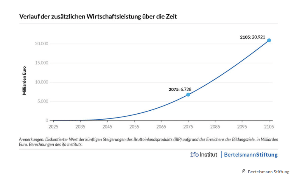 Bessere Bildungsleistungen würden das deutsche Bruttoinlandsprodukt (BIP) bis zum Jahr 2105 um insgesamt rund 20,9 Billionen Euro zusätzlich wachsen lassen. Das entspricht ungefähr dem fünffachen Wert des derzeitigen Gesamt-BIP der Bundesrepublik, welches 2024 rund 4,33 Billionen Euro betrug. Das geht aus Berechnungen des ifo Zentrums für Bildungsökonomik im Auftrag der Bertelsmann Stiftung hervor. Die Forscher:innen stützen sich dabei auf den wissenschaftlich erwiesenen Zusammenhang, wonach ein höheres Bildungsniveau der Bevölkerung langfristig zu mehr Wirtschaftswachstum führt.