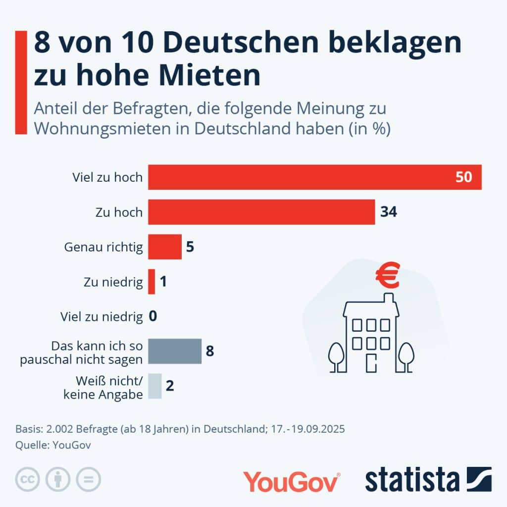 Acht von zehn Deutschen sind der Meinung, dass die Mieten zu hoch (34 Prozent) oder viel zu hoch (50 Prozent) sind. Das geht aus einer aktuellen Umfrage von YouGov und Statista hervor. Dass die Bundesbürger:innen damit richtig liegen, zeigen Presseberichte der letzten Monate: “Mieten in Deutschland explodieren” (Berliner Morgenpost, August), “Mietwohnungsmarkt bleibt extrem angespannt” (Spiegel Online, Juli), “Großstadt-Mieten seit 2015 um 50 Prozent gestiegen (Tagesschau, Juni).