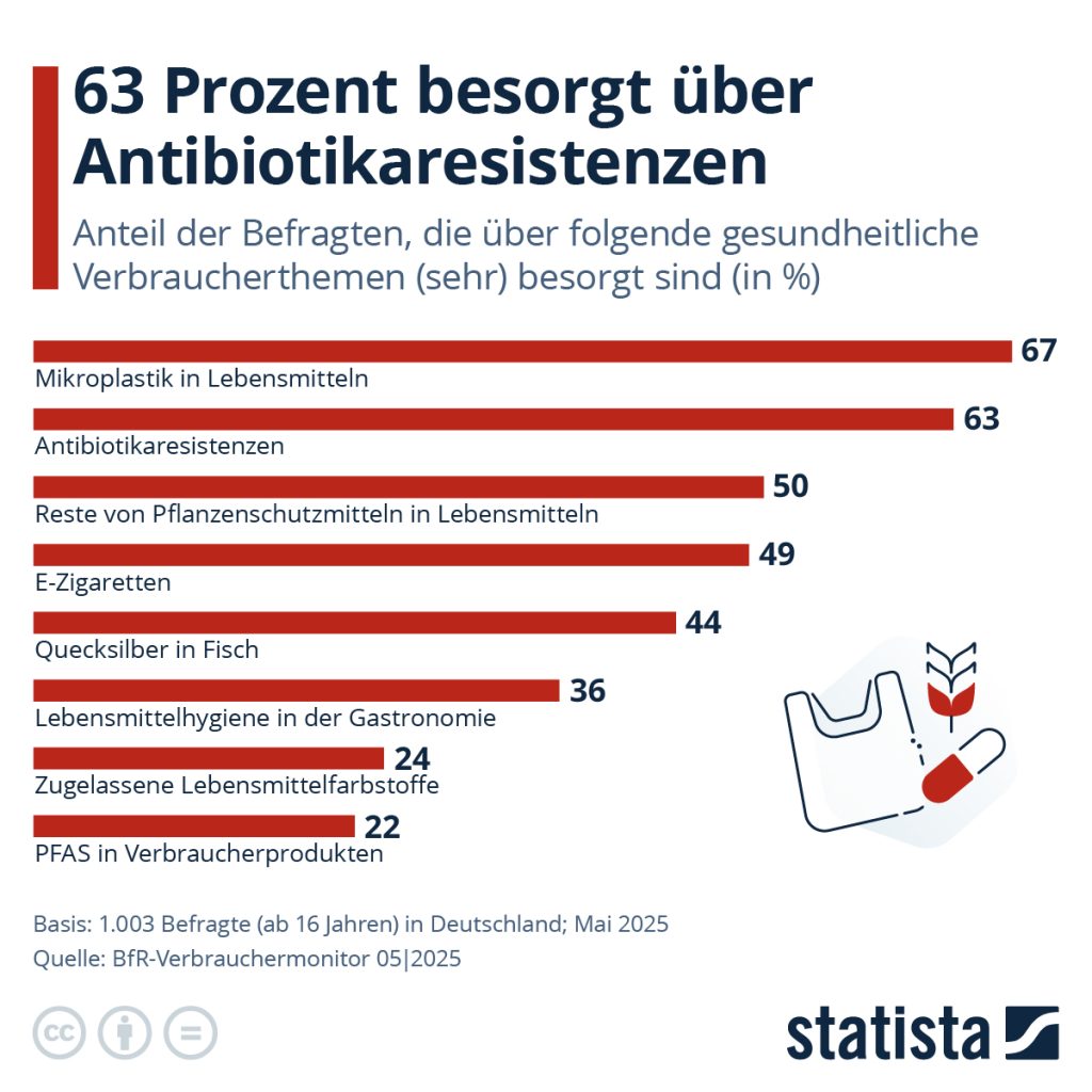 63 Prozent der im Auftrag des Bundesinstituts für Risikobewertung befragten Verbraucher:innen sorgen sich um Antibiotikaresistenzen. Nur Mikroplastik beschäftigt die Menschen hierzulande noch mehr, wie der Blick auf die Statista-Grafik zeigt.