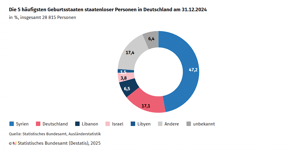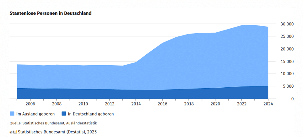 In Deutschland sind aktuell 28.800 Menschen mit dem Status einer anerkannten Staatenlosigkeit registriert. Wie das Statistische Bundesamt (Destatis) anlässlich des Tages der Menschenrechte am 10. Dezember 2025 mitteilt, bedeutet dies einen leichten Rückgang um 700 Personen gegenüber dem Vorjahreshöchststand. Als staatenlos gilt, wer von keinem Staat als Staatsangehöriger anerkannt wird – ein Status, der häufig im Asyl- oder Aufenthaltsverfahren festgestellt wird.