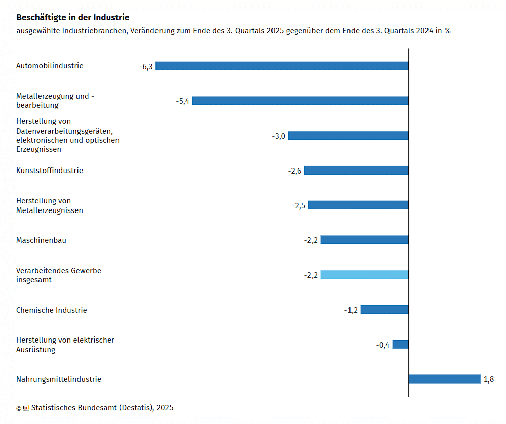 Im Vergleich zum gesamten Verarbeitenden Gewerbe ist der Rückgang in der Automobilindustrie überdurchschnittlich hoch: Über alle Branchen hinweg sank die Zahl der Beschäftigten um 2,2 % auf etwa 5,43 Millionen.