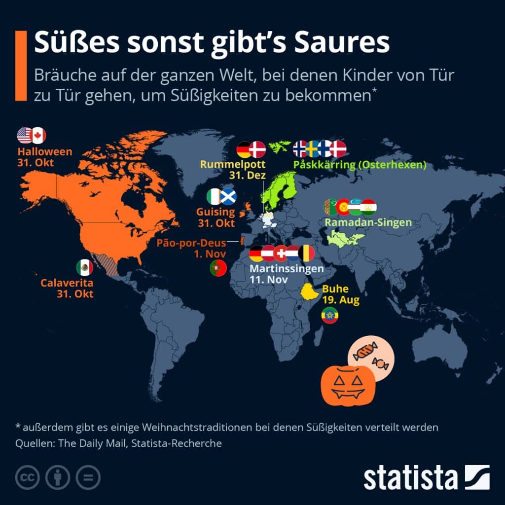 Gruselige Verkleidungen und Süßes-oder-Saures-Bräuche sind indes nicht an ein bestimmtes Datum gebunden: Skandinavische Kinder machen sie um Ostern herum, während die Kinder in Norddeutschland und Süddänemark Silvester wählen. In Süddeutschland, Österreich, der Schweiz, den Niederlanden und Flandern in Belgien werden die Süßigkeiten nicht durch Drohungen, sondern für Lieder verteilt, die die Kinder am 11. November (St. Martinstag) singen. Auch in Zentralasien wird während des Ramadans für Süßigkeiten gesungen. (Quelle: Statista/cw)