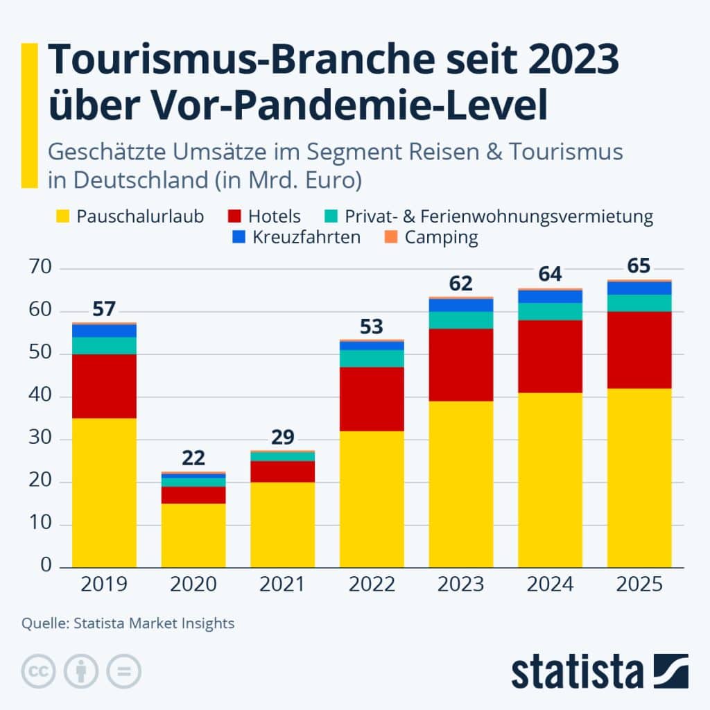 Die deutsche Reise- und Tourismusbranche hat Schätzungen der Statista Market Insights zufolge im Jahr 2023 das Niveau von vor der Corona-Krise übertroffen und wird bis 2025 leicht weiter wachsen. Der Umsatz im Kreuzfahrtsegment wird 2025 etwa 3 Milliarden Euro betragen. Der Markt für Pauschalurlaube ist mit einem erwarteten Volumen von 42 Milliarden Euro im Jahr 202 das größte Segment.