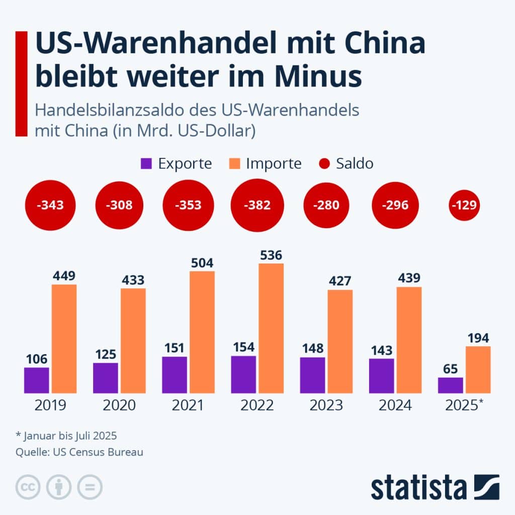 Der Saldo des US-Warenhandels mit China wird liegt nach Daten des US Census Bureaus zufolge auch im Jahr 2025 deutlich im Minus. Im Zeitraum von Januar bis Juli 2025 liegt der Anteil der Exporte am gesamten US-Warenhandel mit China bei lediglich 25 Prozent. Der Saldo aus Exporten abzüglich Importen beträgt in diesem Zeitraum Minus 129 Milliarden US-Dollar. Seit den 1980er Jahren importieren die USA regelmäßig mehr aus China als sie exportieren – besonders seit China in die Weltwirtschaft integriert wurde (WTO-Beitritt im Jahr 2001). Das Defizit schwankt dabei über die Jahre. Es ist abhängig vom Verlauf der Konjunktur, den Wechselkursen, Handelsabkommen oder Zöllen.