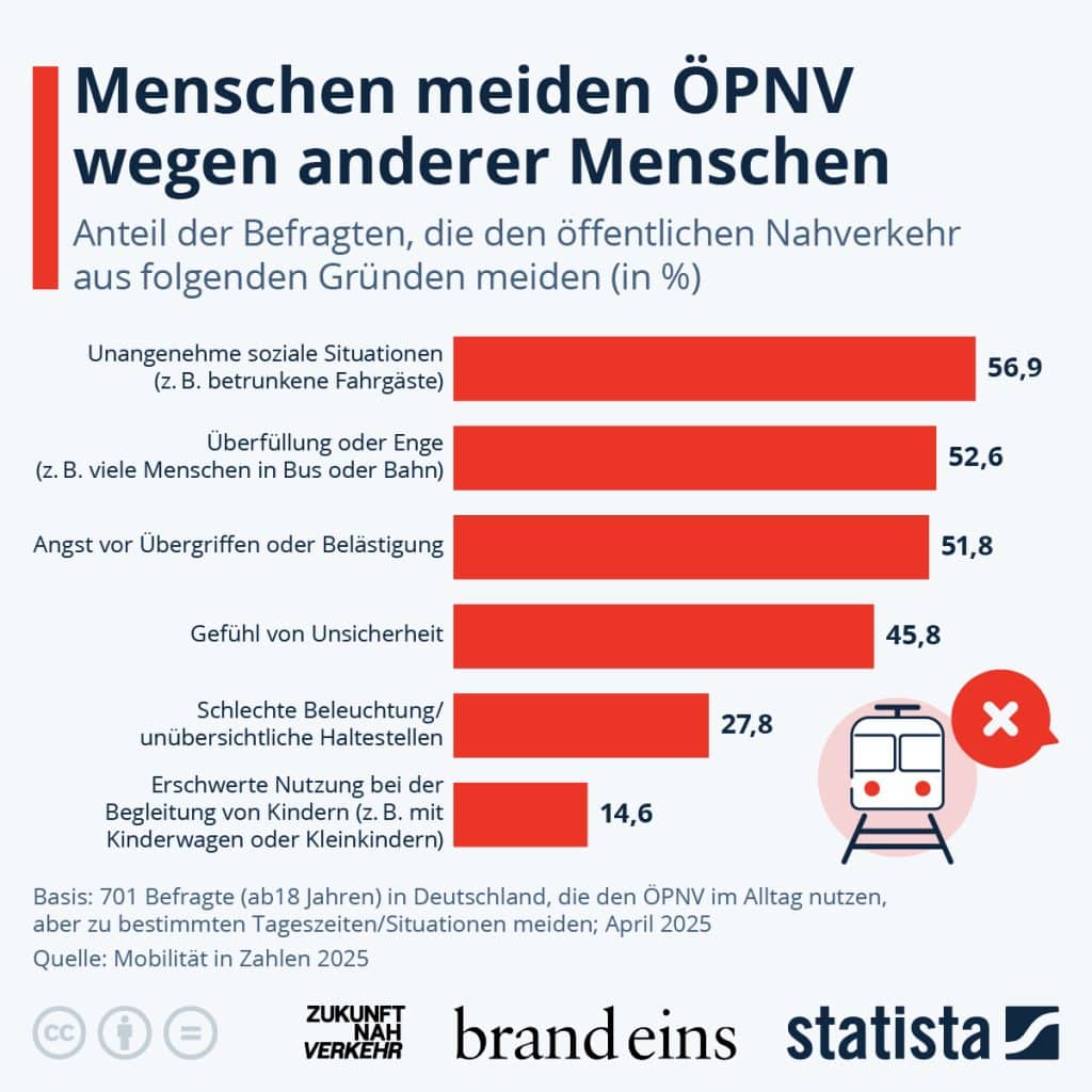 Mehr als zwei Drittel derjenigen, die den öffentlichen Nahverkehr in ihrem Alltag nutzen, meiden ihn zu bestimmten Tageszeiten, wie eine Statista-Umfrage für den von brandeins und Zukunft Nahverkehr veröffentlichten Report “Mobilität in Zahlen 2025” zeigt. Dafür sind vor allem andere Menschen verantwortlich.