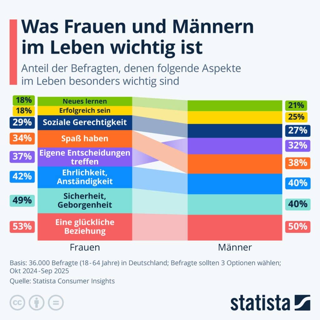 Eine glückliche Beziehung zu führen ist sowohl Frauen als auch Männern in Deutschland besonders wichtig. Wie eine Umfrage der Statista Consumer Insights außerdem zeigt, haben die Merkmale Sicherheit und Geborgenheit bei Frauen im Schnitt einen höheren Stellenwert als bei Männern. Gleiches trifft auf den Aspekt “Eigene Entscheidungen treffen” zu. Umgekehrt haben die befragten Männer häufiger “Spaß haben” und “Erfolgreich sein” angekreuzt. Für die Umfrage wurden 36.000 Menschen in Deutschland befragt, dabei sollten die Befragten jeweils 3 Optionen auswählen.