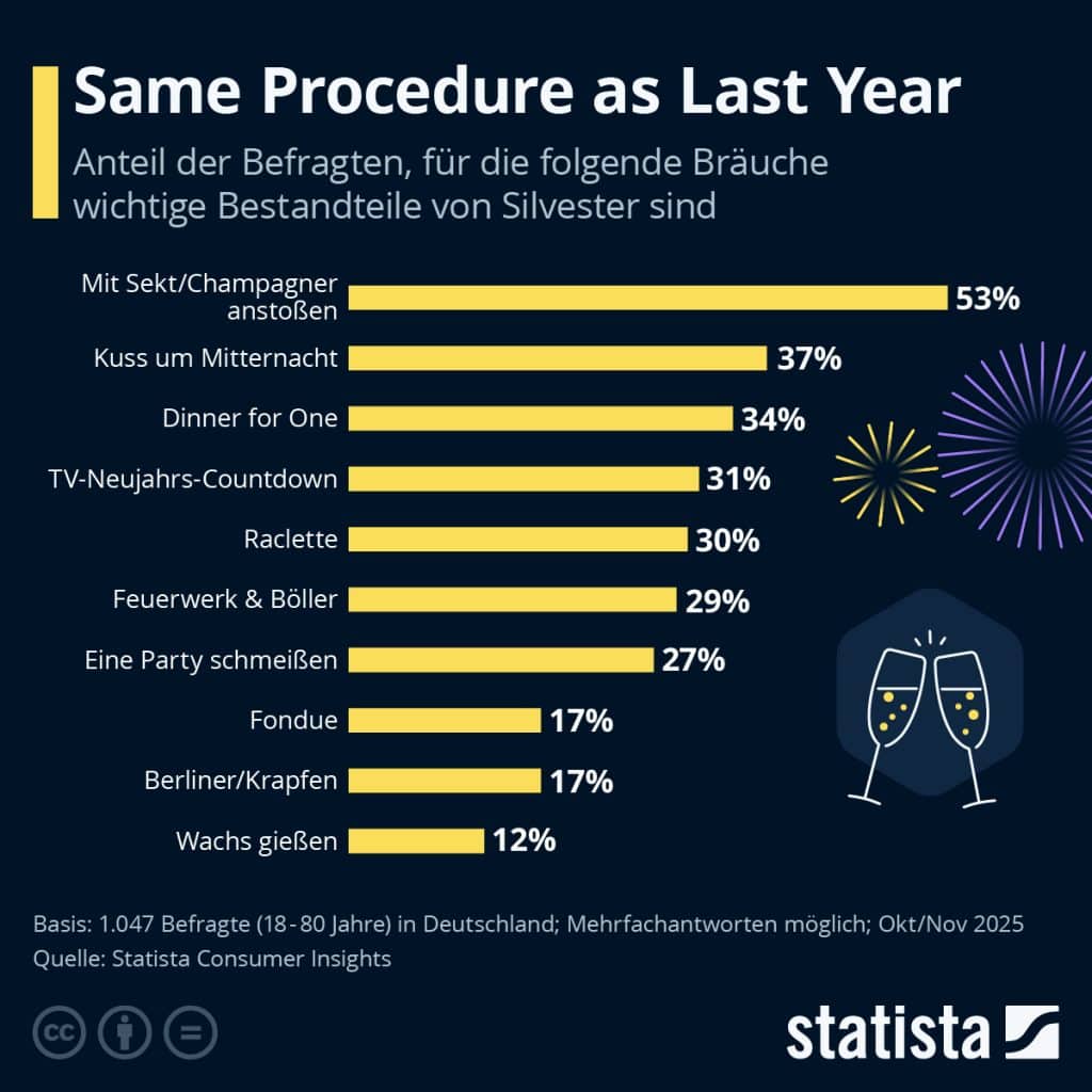 Ebenfalls weit verbreitet ist der Kuss um Mitternacht. Eine der ältesten Silvestertraditionen der Bundesrepublik ist das “Dinner for One”. Seit fast 60 Jahren wird der Sketch mit Freddie Frinton und May Warden hierzulande ausgestrahlt. Und auch dieses Jahr werden wieder viele einschalten, wie der Blick auf die Grafik zeigt. Ähnlich beliebt ist der Neujahrs-Countdown im Fernsehen. Die wichtige Frage, Raclette oder Fondue entscheidet ersteres deutlich für sich. Eine weitere kulinarische Tradition ist das verspeisen von Berlinern oder Krapfen oder Pfannkuchen – welche Bezeichnung das gefüllte Gebäck hat, hängt von der Region ab. (Quelle: Statista/cw)