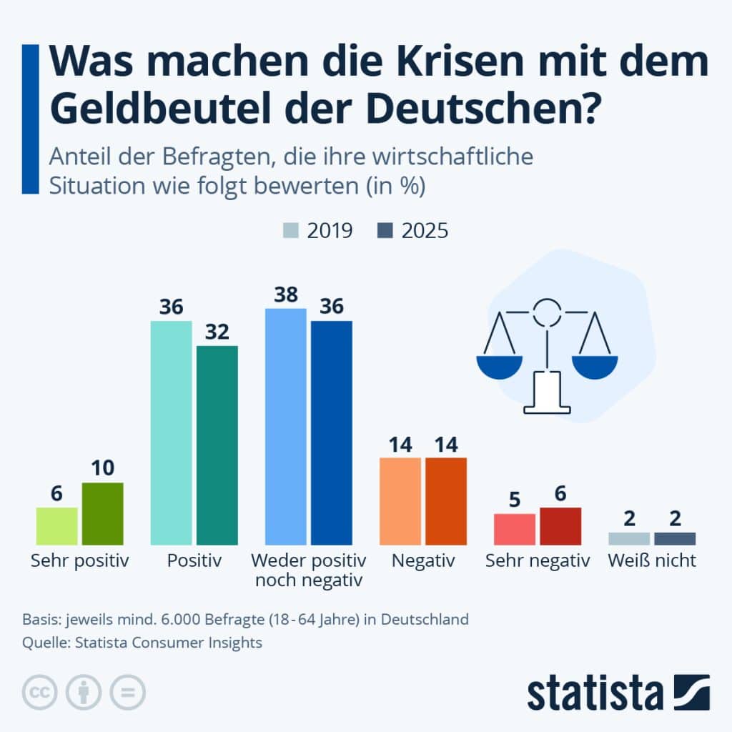 Die Corona-Pandemie, der Krieg in der Ukraine und die dadurch bedingt die starken Preissteigerungen – seit dem Jahr 2020 hat sich die wirtschaftliche Situation der Bundesrepublik zusehends verschlechtert. Wie stark hat sich das auf die Finanzen der Bundesbürger ausgewirkt? Wie die Statista Consumer Insights Umfragen aus den Jahren 2019 und 2025 zeigen, ist der Anteil der Befragten mit einer positiven und einer weder positiven noch negativen Bewertung nur leicht kleiner geworden. Mit 4 Prozentpunkten deutlicher gestiegen ist hingegen der Anteile der Befragten mit einer sehr positiven Bewertung der und in sehr geringem Maße auch der mit einer sehr negativen Einschätzung (+1 Prozentpunkt).