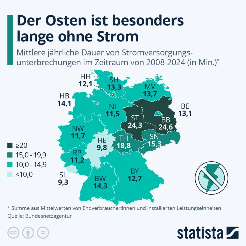 Die ostdeutschen Bundesländer Brandenburg, Sachsen-Anhalt, Thüringen und Sachsen sind im Jahresmittel besonders stark von Stromausfällen betroffen. Das zeigt die Statista-Infografik mit Daten der Bundesnetzagentur. Brandenburg und Sachsen-Anhalt weisen dabei im Durchschnitt der Jahre 2008 bis 2024 besonders hohe Werte von deutlich über 20 Minuten auf. Hessen und das Saarland liegen mit Zeiten von unter zehn Minuten am unteren Ende des Bundesländervergleichs. Das aktuell von einem relativ weiträumigen und lang andauernden Stromausfall betroffene Berlin liegt dagegen im genannten Zeitraum mit rund 13 Minuten im Mittelfeld.